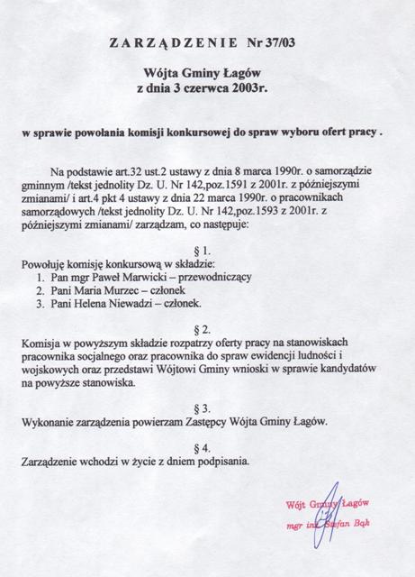 | Zarządzenie nr 37/03 Wójta Gminy Łagów z dn. 3 czerwca 2003 r. w sprawie powołania komisji konkursowej do spraw wyboru ofert pracy. | 2008-10-23 |