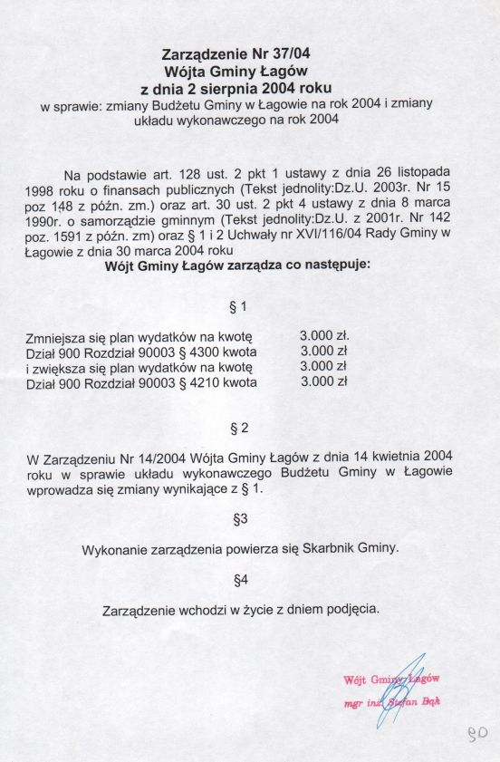 | Zarządzenie nr 37/04 Wójta Gminy Łagów z dn. 2 sierpnia 2004 r. w sprawie: zmiany Budżetu Gminy w Łagowie na rok 2004 i zmiany układu wykonawczego na rok 2004. | 2008-10-22 |