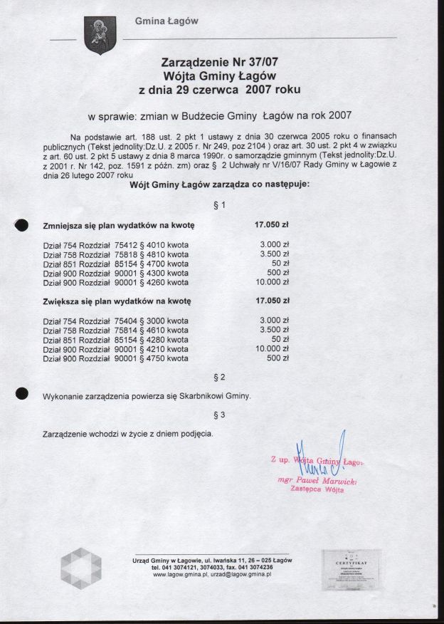 | Zarządzenie nr 37/07 Wójta Gminy łagów z dn. 29 czerwca 2007 r. w sprawie zmian w Budżecie Gminy Łagów na rok 2007. | 2008-08-25 |