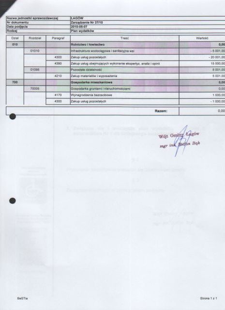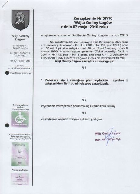 | Zarządzenie Nr 37/10 Wójta Gminy Łagów z dnia 07 maja 2010 roku w sprawie zmian w Budżecie Gminy Łagów na rok 2010 | 2010-09-02 |