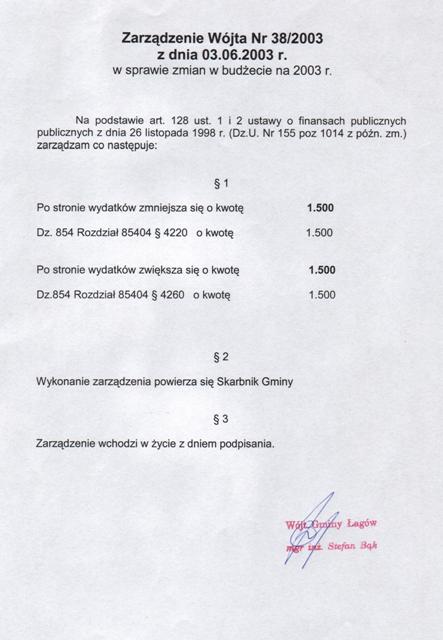 | Zarządzenie nr 38/03 Wójta Gminy Łagów z dn. 3 czerwca 2003 r. w sprawie zmian w budżecie na 2003 r. | 2008-10-23 |