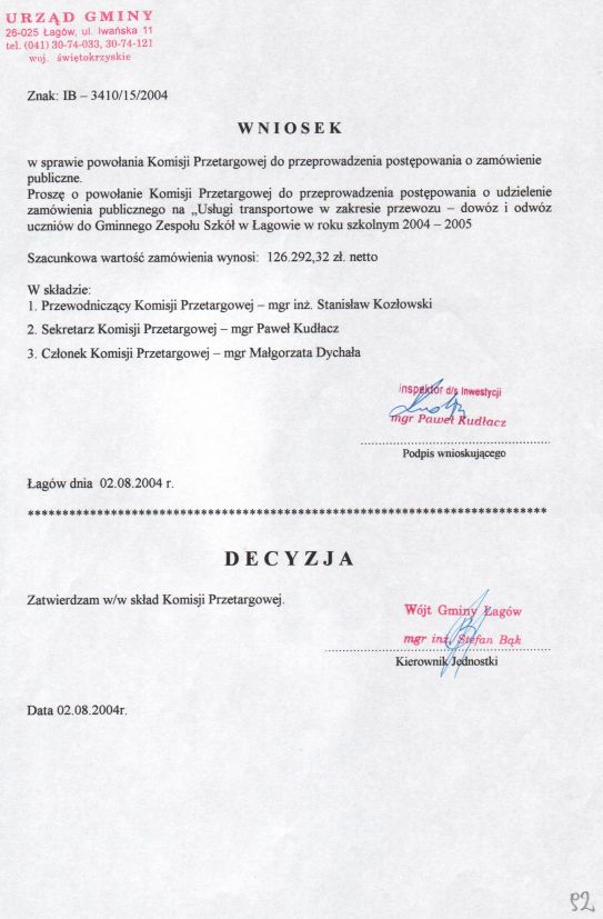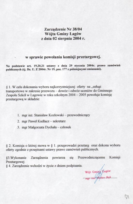 | Zarządzenie nr 38/04 Wójta Gminy Łagów z dn. 2 sierpnia 2004 r. w sprawie powołania komisji przetargowej. | 2008-10-22 |