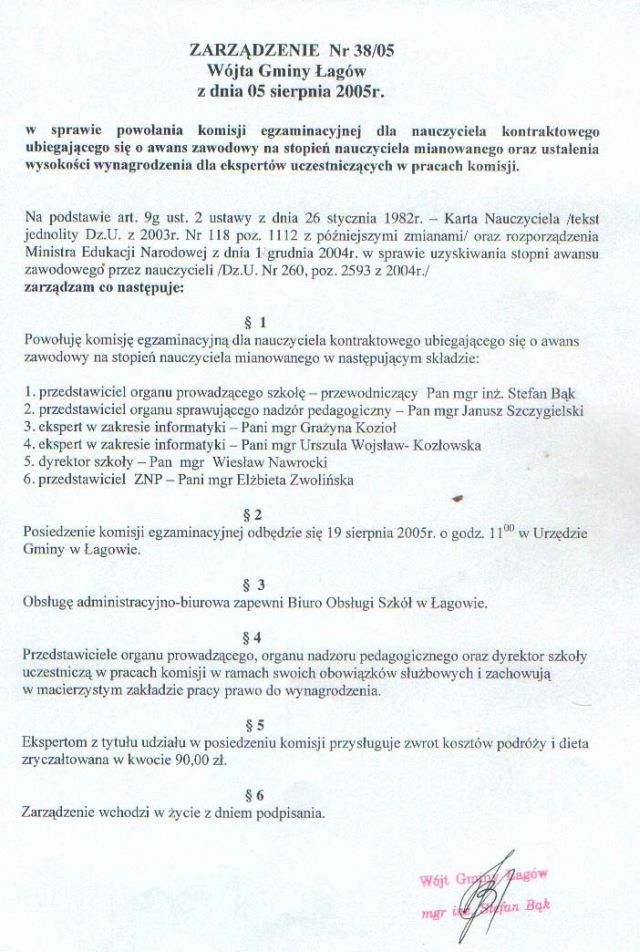 | Zarządzenie nr 38/05 Wójta Gminy Łagów z dn. 5 sierpnia 2005 r. w sprawie powołania komisji egzaminacyjnej dla nauczyciela kontraktowego ubiegającego sie o awans zawodowy. | 2008-10-17 |