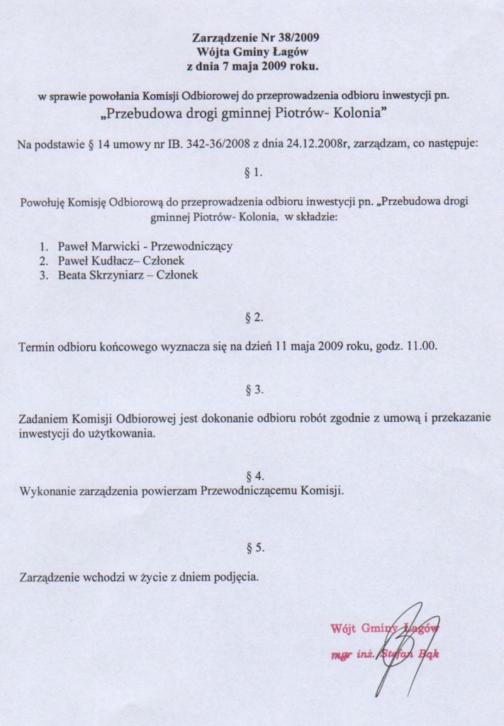 | Zarządzenie nr 38/09Wójta Gminy Łagów z dnia 7 maja 2009 r. w sprawie powołania Komisji Odbiorowej | 2009-06-12 |