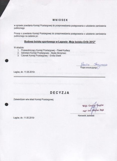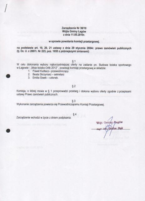 | Zarządzenie Nr 38/10 Wójta Gminy Łagów z dnia 11 .05.2010 r. w sprawie powołania komisji przetargowej | 2010-09-03 |