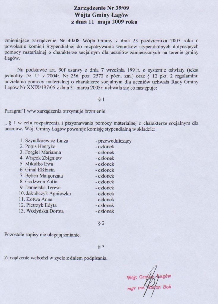 | Zarządzenie nr 39/09 Wójta Gminy Łagów zdnia 11 maja 2009 r. zmieniające zarządzenie nr 40/08 z dnia 23 październiak 2008 r. | 2009-06-12 |