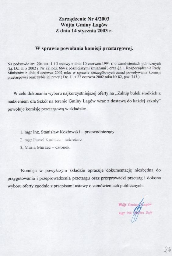 | Zarządzenie nr 4/03 Wójta Gminy Łagów z dn. 14 stycznia 2003 r. w sprawie powołania komisji przetargowej. | 2008-10-23 |