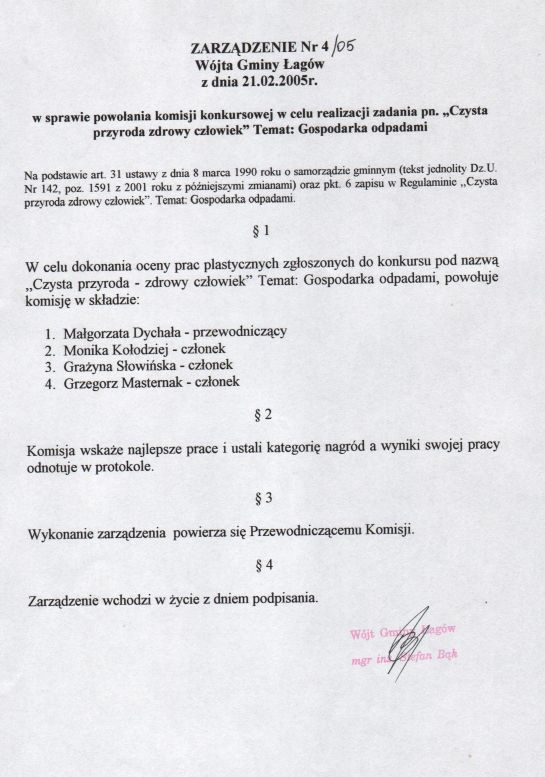 | Zarządzenie nr 4/05 Wójta Gminy Łagów z dn. 21 lutego 2005 r. w sprawie powołania komisji konkursowej w celu realizacji zadania pn. „Czysta przyroda zdrowy człowiek” Temat : Gospodarka odpadami. | 2008-10-17 |