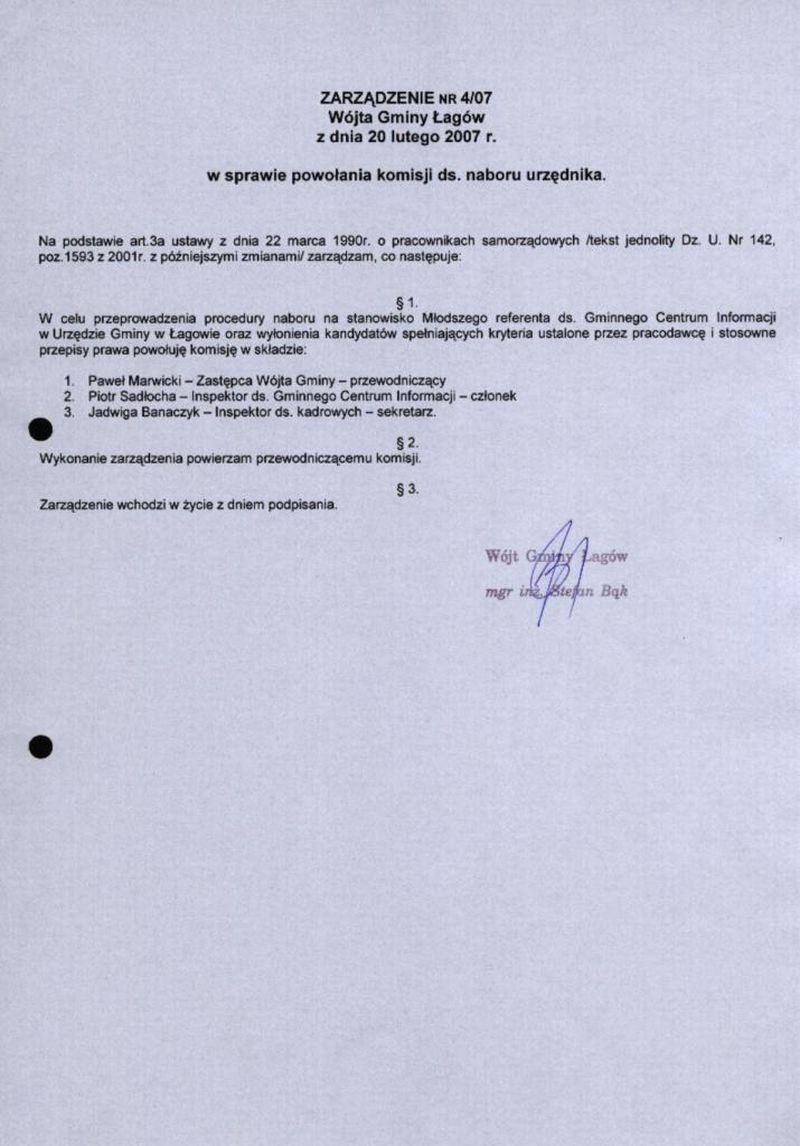 | Zarządzenie nr 4/07 Wójta Gminy Łagów z dn. 20 lutego 2007 r. w sprawie powołania komisji ds. naboru urzędnika. | 2008-08-25 |