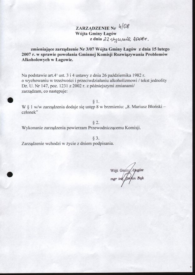 | Zarządzenie nr 4/08 Wójta Gminy Łagów z dn. 22 stycznia 2008 r. zmieniające zarządzenie nr 3/07 Wójta Gminy Łagów z dn. 15 lutego 2007 r. w sprawie powołania Gminnej Komisji Rozwiązywania Problemów Alkocholowych w Łagowie. | 2008-08-23 |