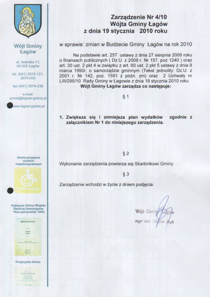 | Zarządzenie nr 4/10 Wójta Gminy Łagów z dnia 19 stycznia 2010 r. w sprawie zmian w Budżecie Gminy Łagów na rok 2010 | 2010-03-04 |