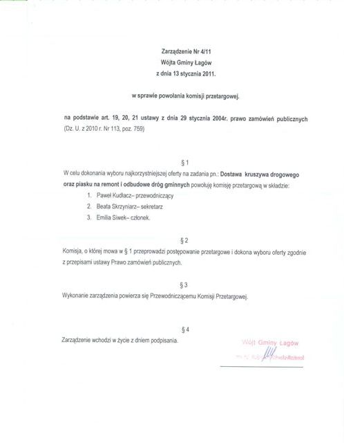| Zarządzenie Nr 4/11 Wójta Gminy Łagów z dnia 13 grudnia 2011 roku w sprawie komisji przetargowej | 2011-02-03 |