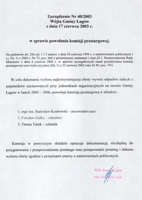 | Zarządzenie nr 40/03 Wójta Gminy Łagów z dn. 17 czerwca 2003 r. w sprawie powołania komisji przetargowej. | 2008-10-23 |