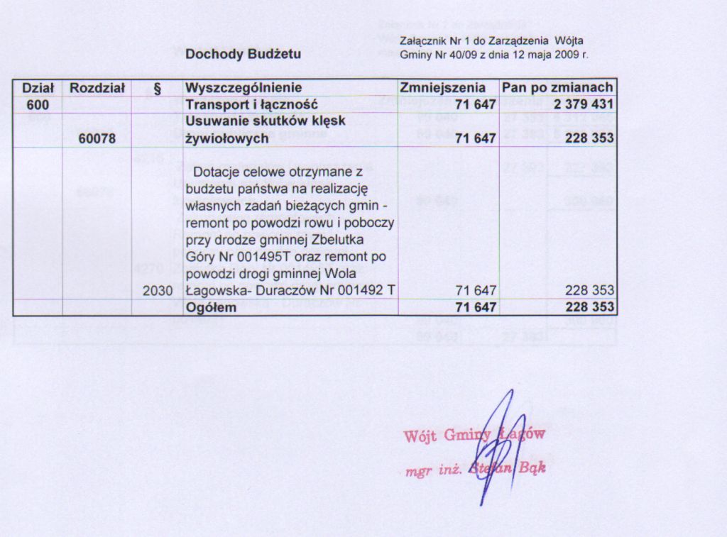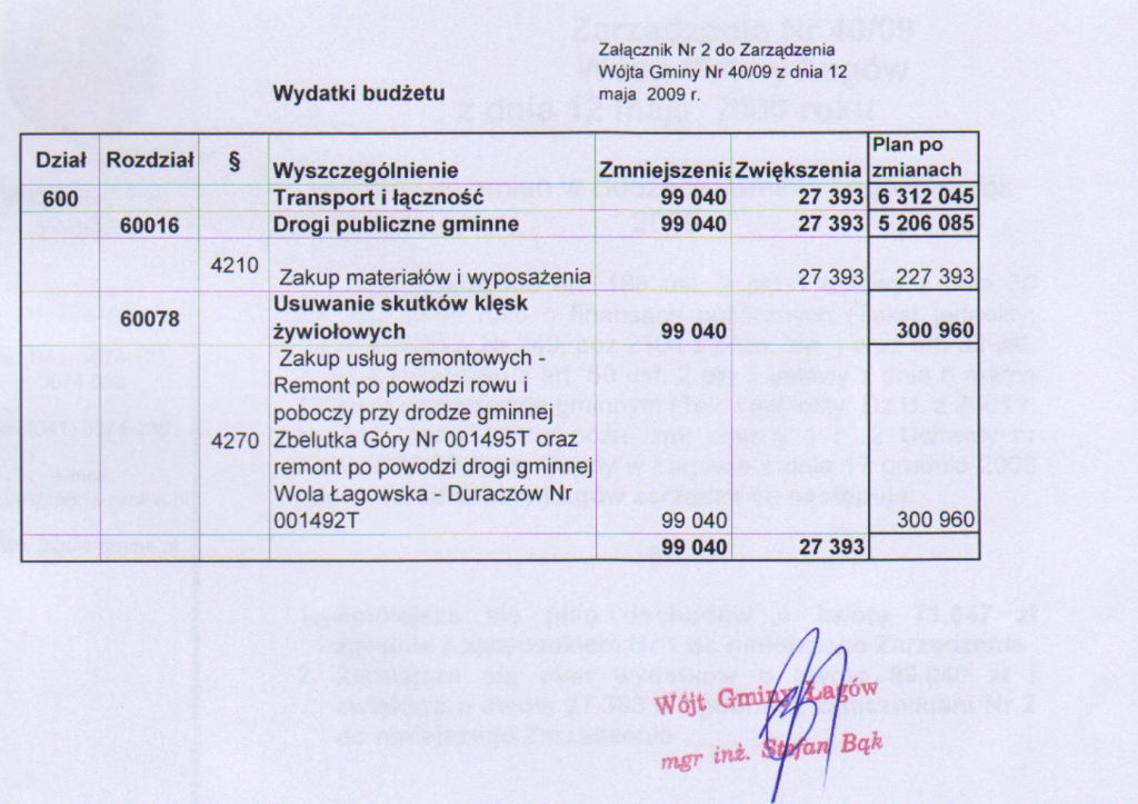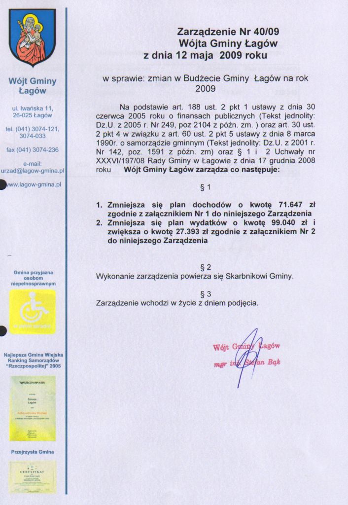 | Zarządzenie nr 40/09 Wójta Gminy Łagów z dnia 12 maja 2009 r. w sprawie zmian w budżecie gminy Łagów na rok 2009 | 2009-06-12 |