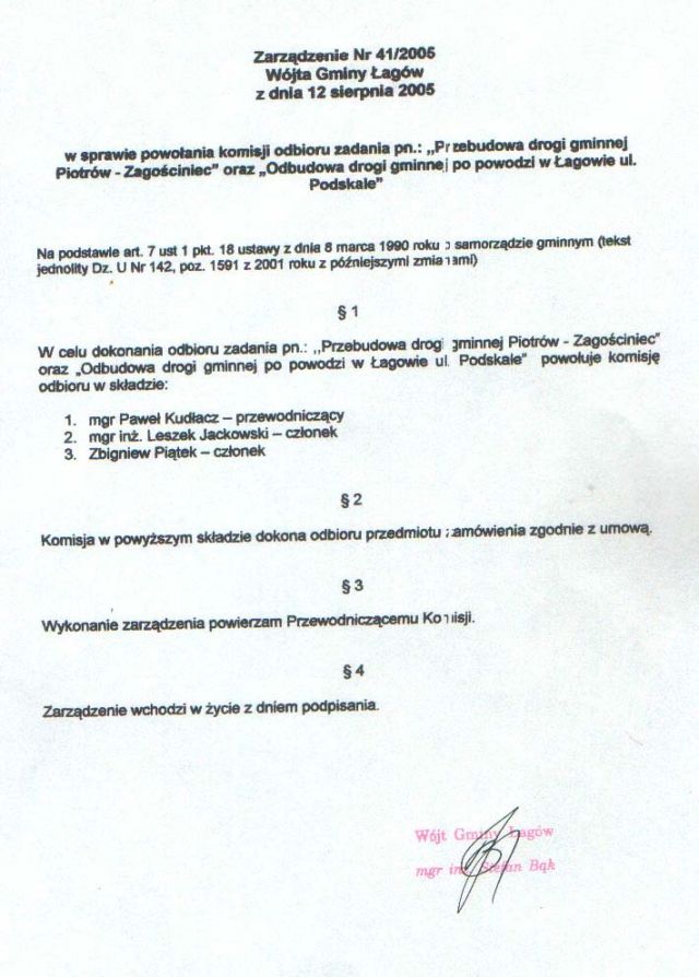 | Zarządzenie nr 41/05 Wójta Gminy Łagów z dn. 12 sierpnia 2005 r. w sprawie powołania komisji odbioru zadania pn.:"Przebudowa drogi gminnej Piotrów - Zagościniec" oraz "Odbudowa drogi gminnej po powodzi w Łagowie ul. Podskale". | 2008-10-17 |