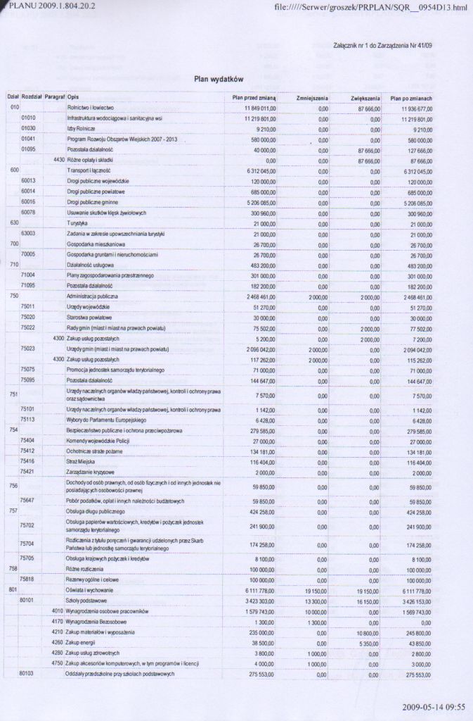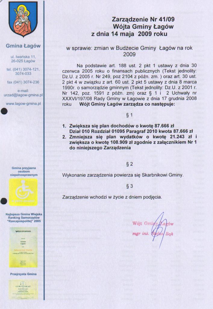 | Zarządzenie nr 41/09 Wójta gminy Łagów z dnai 14 maja 2009 r. w sprawie zmian w budżecie gminy Łagów | 2009-06-12 |
