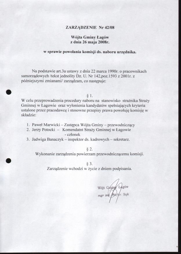 | Zarządzenie nr 42/08 Wójta Gminy Łagów z dn. 26 maja 2008 r. w sprawie powołania komisji ds. naboru urzędnika. | 2008-08-25 |