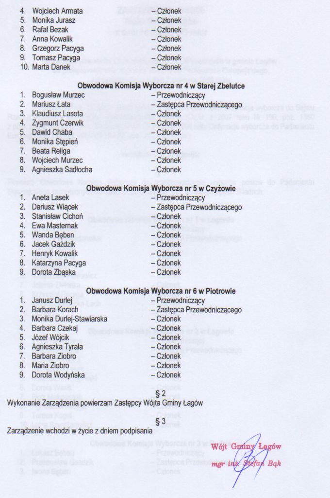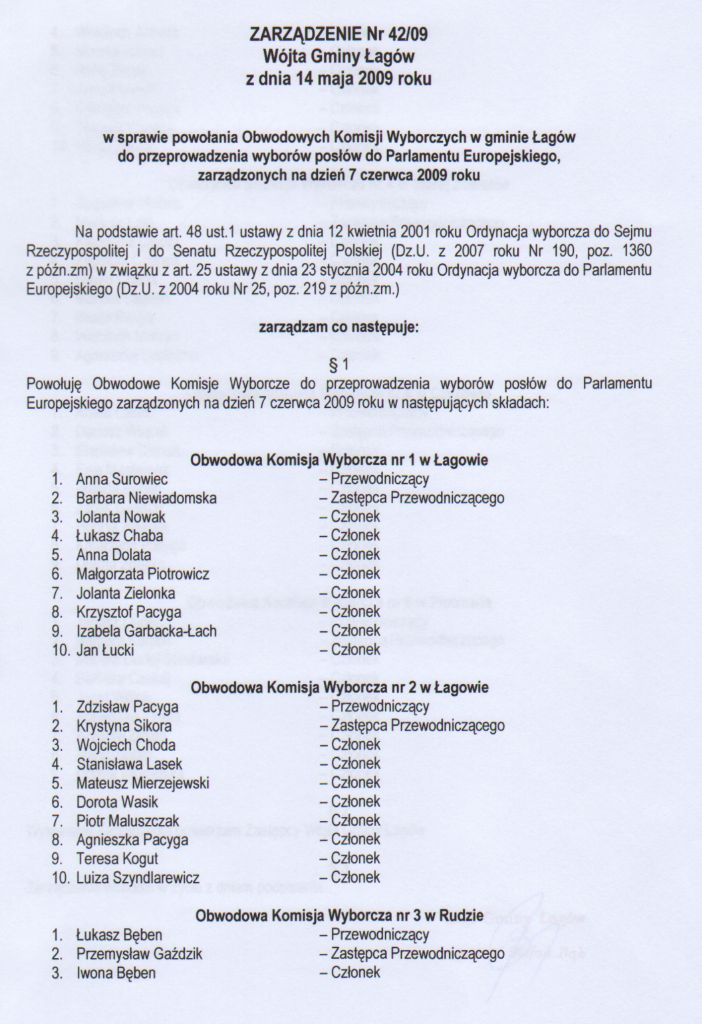 | Zarządzenie nr 42/09 Wójta Gminy Łagów z dnia 14 maja 2009 r. w sprawie powołania Obwodowych Komisji Wyborczych w gminie Łagów do przeprowadzenia wyborów posłów do Parlamentu Europejskiego | 2009-06-12 |