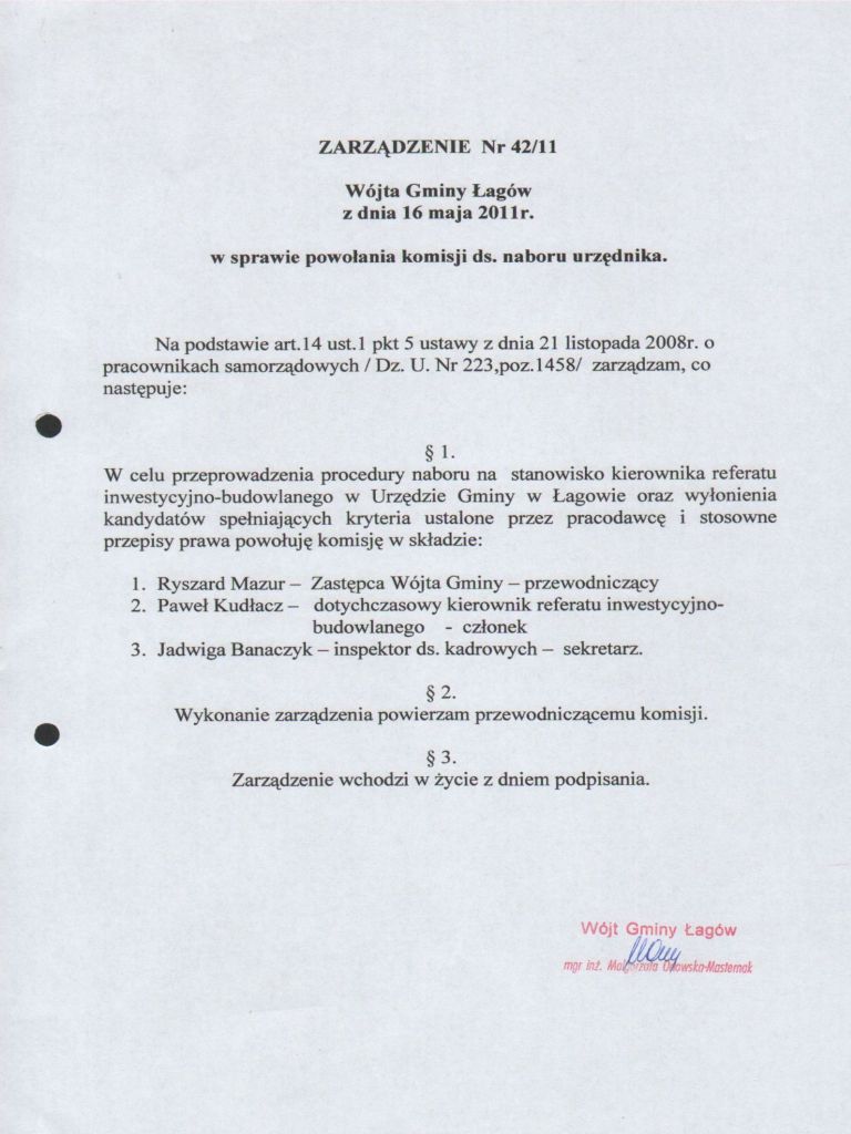| Zarządzenie Nr 42/11 Wójta Gminy Łagów z dnia 16 maja 2011 r. w sprawie powołania komisji ds. naboru urzędnika | 2012-10-03 |