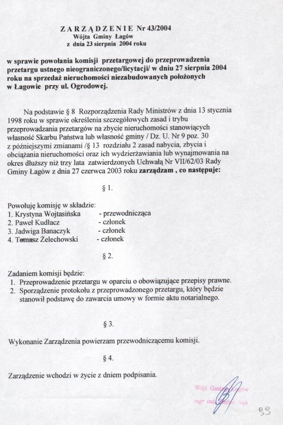| Zarządzenie nr 43/04 Wójta Gminy Łagów z dn. 23 sierpnia 2004 r. w sprawie powołania komisji przetargowej. | 2008-10-22 |