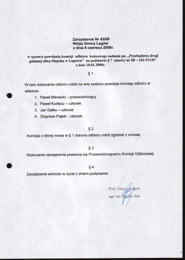 | Zarządzenie nr 43/08 Wójta Gminy Łagów z dn. 6 czerwca 2008 r. w sprawie powołania komisji odbioru końcowego zadania pn. "Pzebudowa drogi gminnej ul. Słupska w Łagowie". | 2008-08-25 |