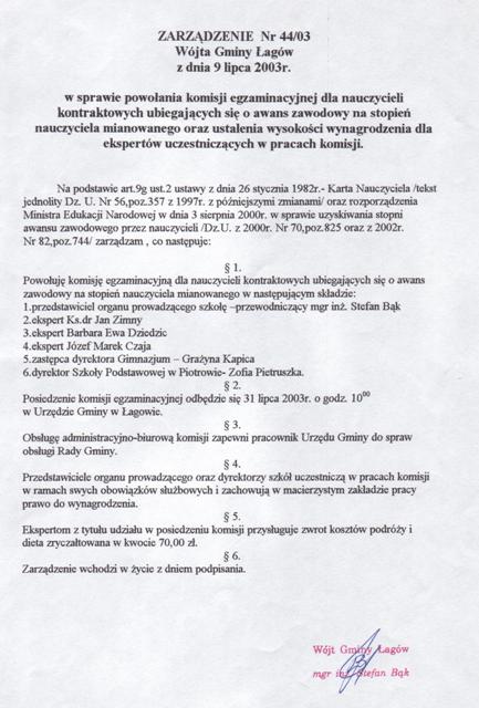 | Zarządzenie nr 44/03 Wójta Gminy Łagów z dn. 9 lipca 2003 r. w sprawie powołania komisji egzaminacyjnej dla nauczycieli kontraktowych ubiegających sie o awans zawodowy. | 2008-10-23 |
