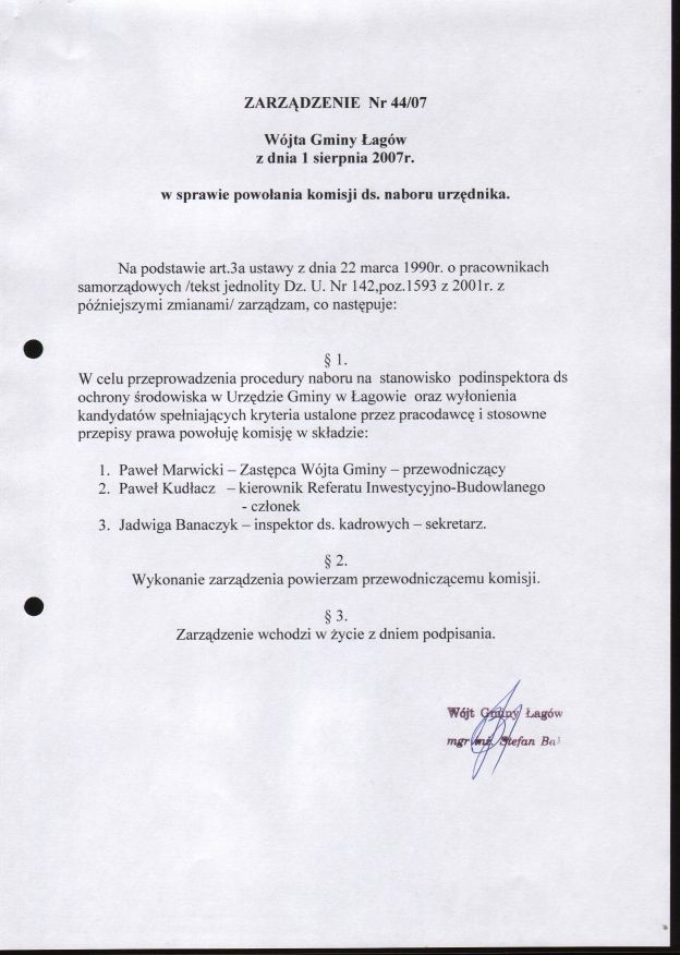 | Zarządzenie nr 44/07 Wójta Gminy Łagów z dn. 1 sierpnia 2007 r. w sprawie powołania komisji ds. naboru urzędnika. | 2008-08-25 |