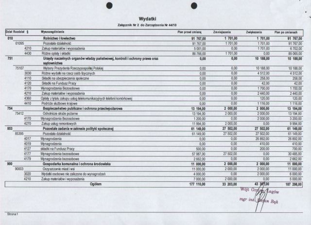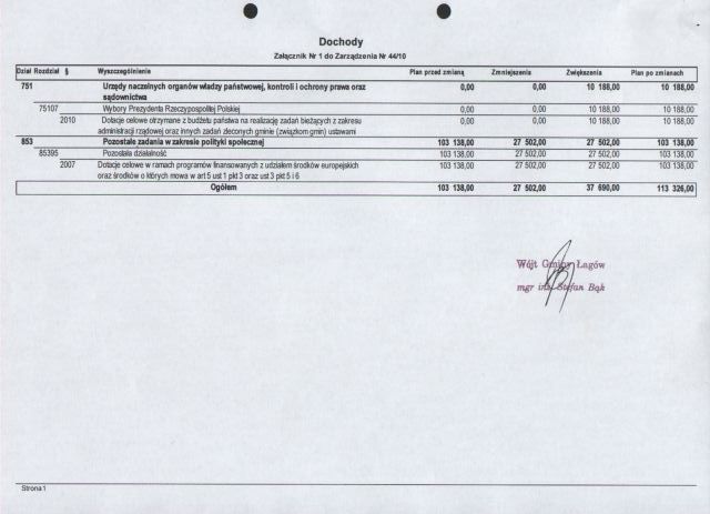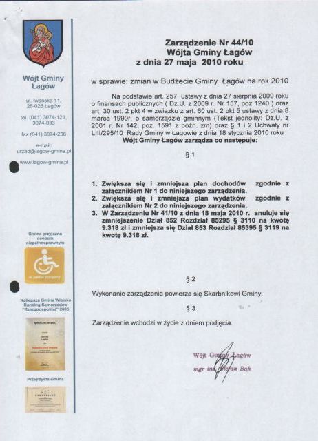 | Zarządzenie Nr 44/10 Wójta Gminy Łagów z dnia 27 maja 2010 roku w sprawie : zmian w Budżecie Gminy Łagów na rok 2010 | 2010-09-07 |