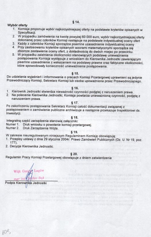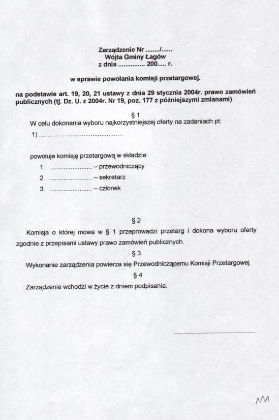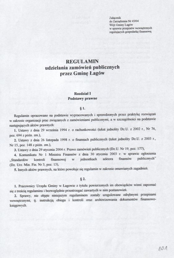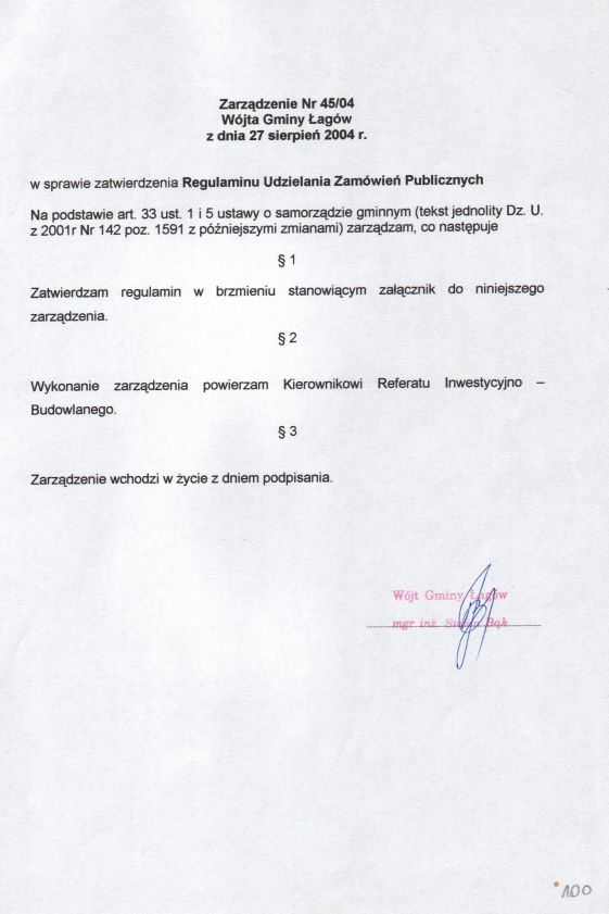 | Zarządzenie nr 45/04 Wójta Gminy Łagów z dn. 27 sierpnia 2004 r. w sprawie zatwierdzenia Regulaminu Udzielania Zamówień Publicznych. | 2008-10-22 |