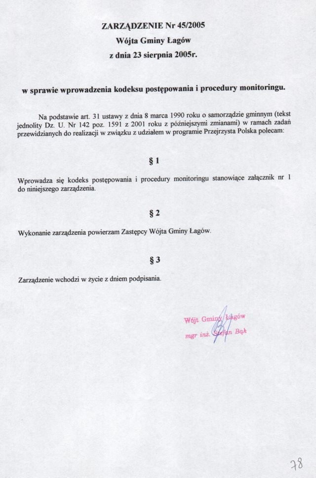 | Zarządzenie nr 45/05 Wójta Gminy Łagów z dn. 23 sierpnia 2005 r. w sprawie wprowadzenia kodeksu postępowania i procedury monitoringu. | 2008-10-17 |