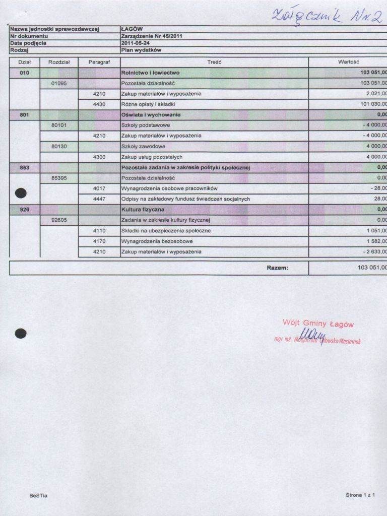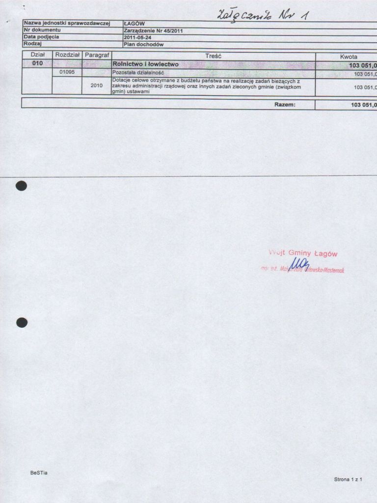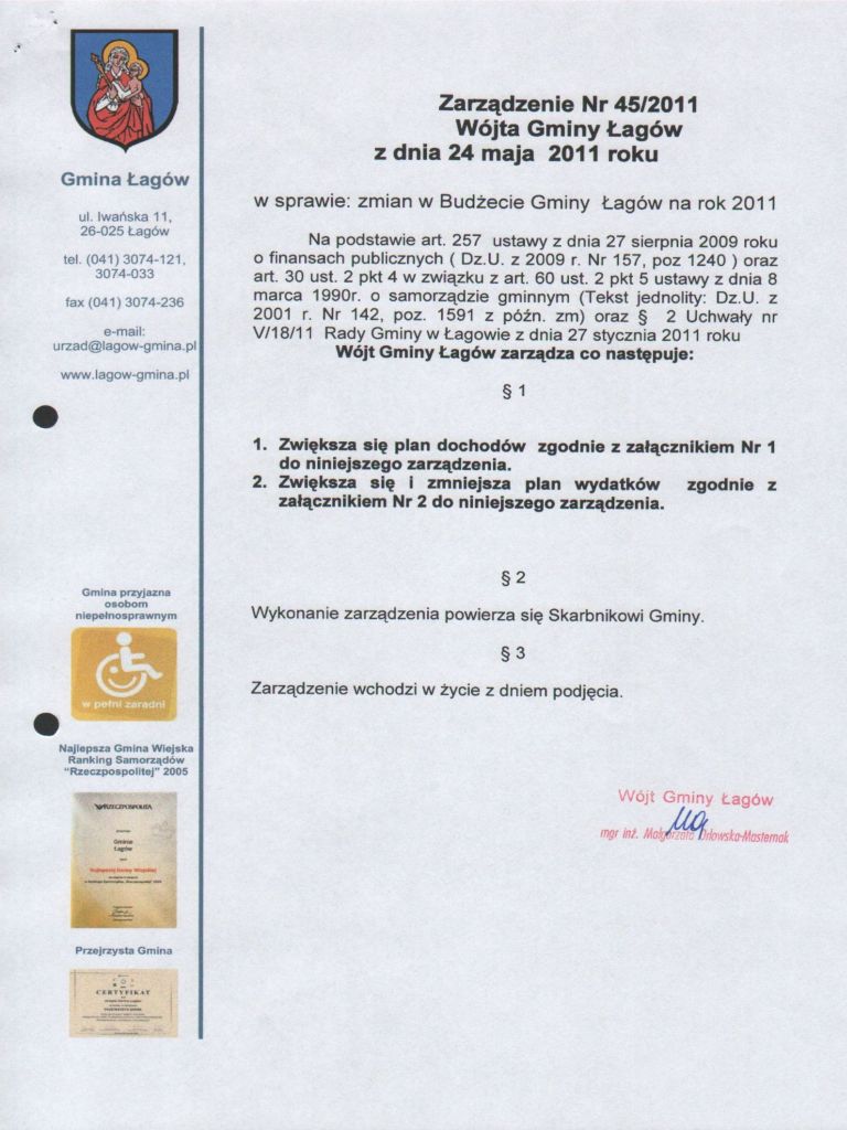 | Zarządzenie Nr 45/2011 Wójta Gminy Łagów z dnia 24 maja 2011 roku w sprawie: zmian w Budżecie Gminy Łagów na rok 2011 | 2012-10-03 |