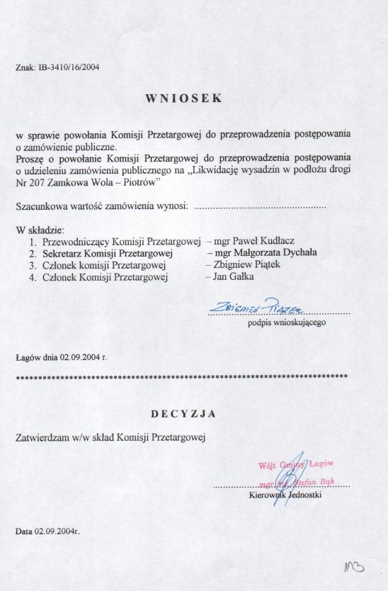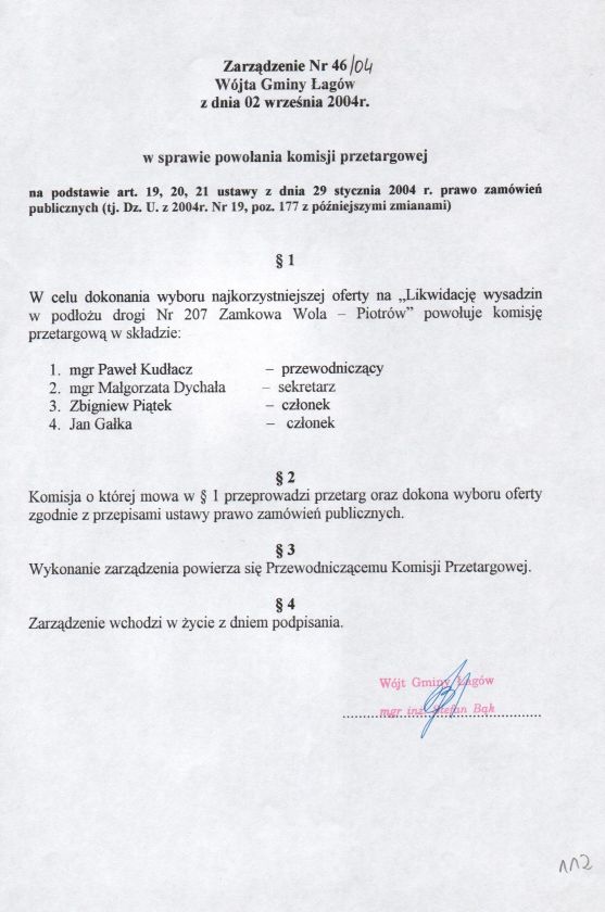 | Zarządzenie nr 46/04 Wójta Gminy Łagów z dn. 2 września 2004 r. w sprawie powołania komisji przetargowej. | 2008-10-22 |