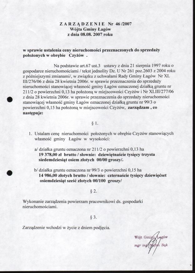 | Zarządzenie nr 46/07 Wójta Gminy Łagów z dn. 8 sierpnia 2007 r. w sprawie ustalenia ceny nieruchomości przeznaczonych do sprzedaży położonych w obrębie Czyżów. | 2008-08-25 |