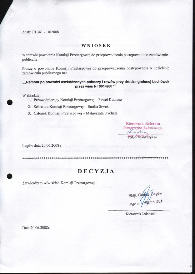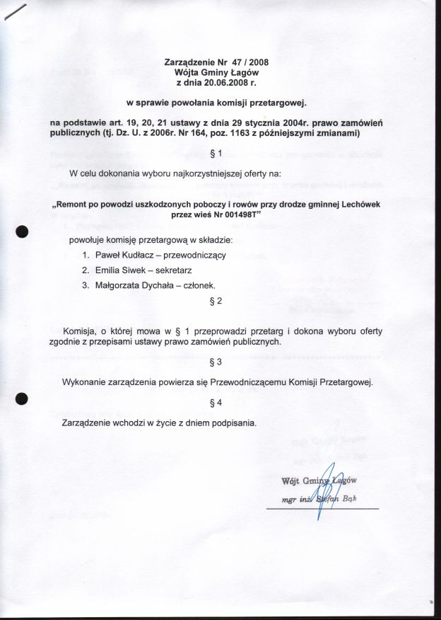 | Zarządzenie nr 47/08 Wójta Gminy Łagów z dn. 20 czerwca 2008 r. w sprawie powołania komisji przetargowej. | 2008-08-25 |