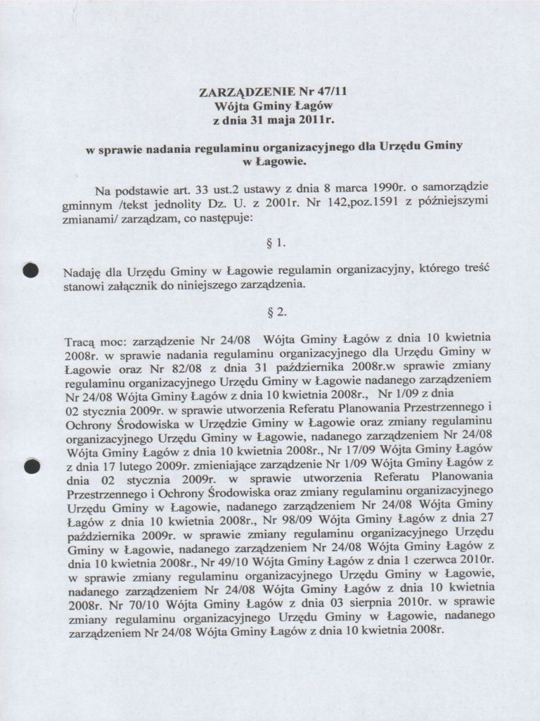 | Zarządzenie Nr 47/11 Wójta Gminy Łagów z dnia 31 maja 2011 r. w sprawie nadania regulaminu organizacyjnego dla Urzędu Gminy w Łagowie | 2012-10-03 |