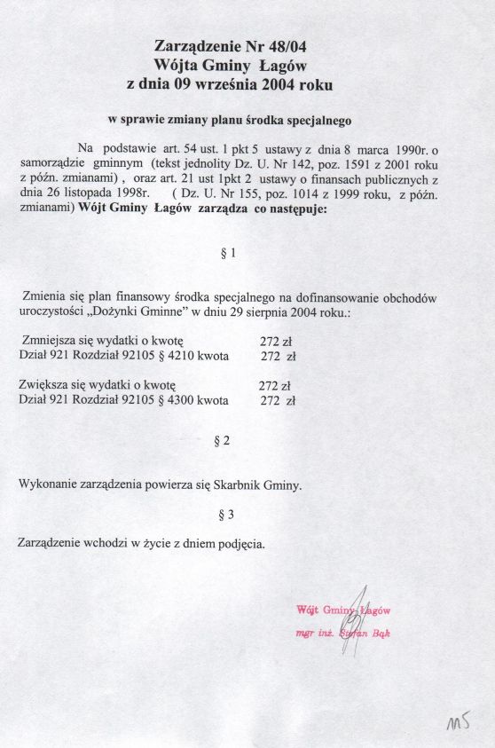 | Zarządzenie nr 48/04 Wójta Gminy Łagów z dn. 9 września 2004 r. w sprawie zmiany planu środka specjalnego. | 2008-10-22 |