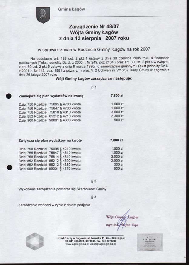 | Zarządzenie nr 48/07 Wójta Gminy Łagów z dn. 13 sierpnia 2007 r. w sprawie zmian w Budżecie Gminy Łagów na rok 2007. | 2008-08-25 |