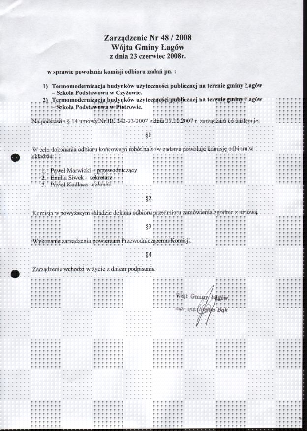 | Zarządzenie nr 48/08 Wójta Gminy Łagów z dn. 23 czerwca 2008 r. w sprawie powołania komisji odbioru zadań pn.: | 2008-08-25 |