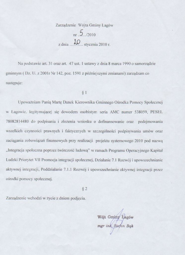 | Zarządzenie nr 5/10 Wójta Gminy Łagów z dnia 20 stycznia 2010 r. w sprawie upoważnienia Kierownika gminnego Ośrodka Pomocy Społecznej w Łagowie | 2010-03-04 |