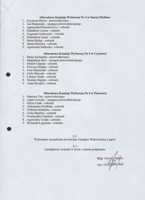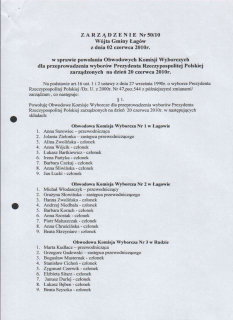 | Zarządzenie Nr 50/10 Wójta Gminy Łagów z dnia 02 czerwca 2010 r. w sprawie powołania Obwodowych Komisji Wyborczych dla przeprowadzenia wyborów Prezydenta Rzeczypospolitej Polskiej zarządzonych na dzień 20 czerwca 2010 r. | 2010-09-07 |