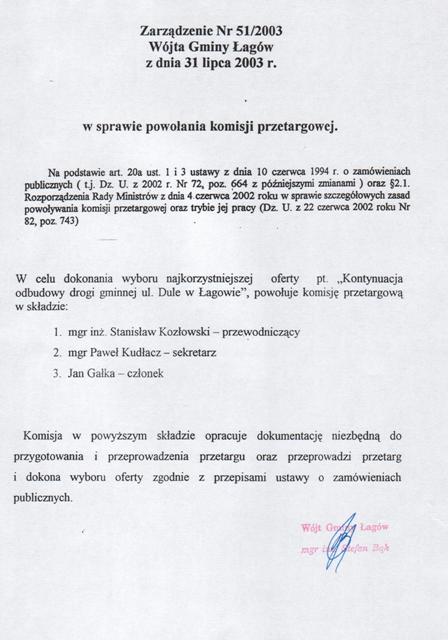 | Zarządzenie nr 51/03 Wójta Gminy Łagów z dn. 31 lipca 2003 r. w sprawie powołania komisji przetargowej. | 2008-10-23 |