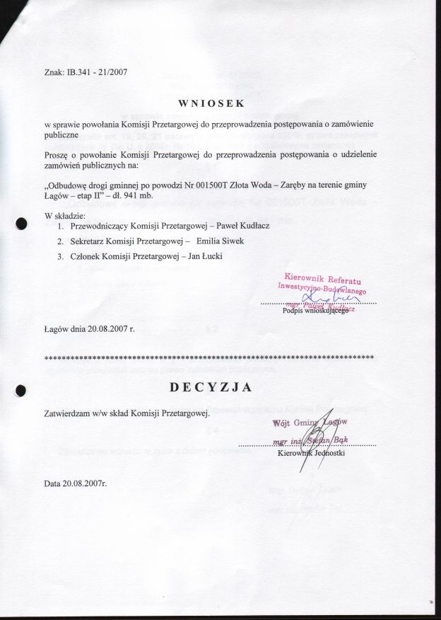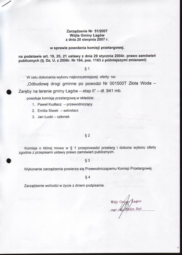 | Zarządzenie nr 51/08 Wójta Gminy Łagów z dn. 20 sierpnia 2007 r. w sprawie powołania komisji przetargowej. | 2008-08-25 |