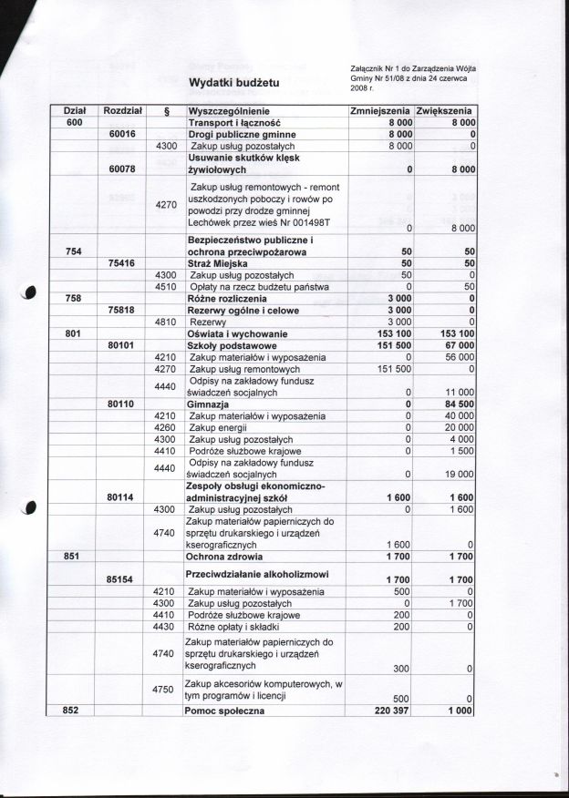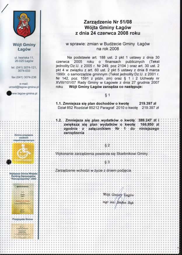 | Zarządzenie nr 51/08 Wójta Gminy łagów z dn. 24 czerwca 2008 r. w sprawie zmian w Budżecie Gminy Łagów na rok 2008. | 2008-08-25 |