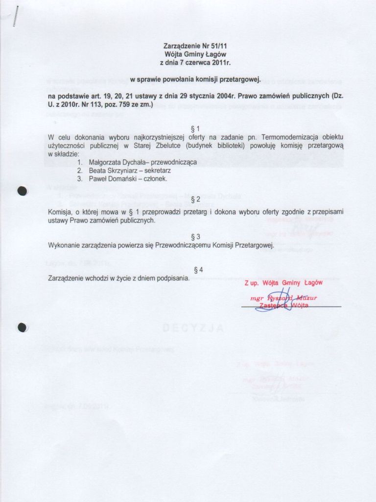 | Zarządzenie Nr 51/11 Wójta Gminy Łagów z dnia 07 czerwca 2011 r. w sprawie powołania komisji przetargowej | 2012-10-03 |