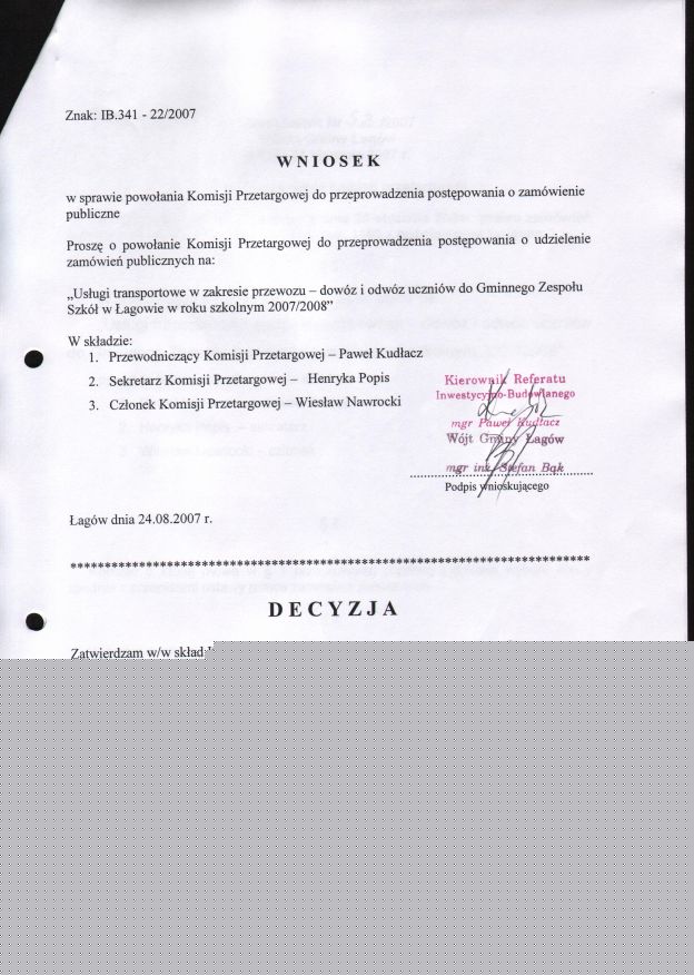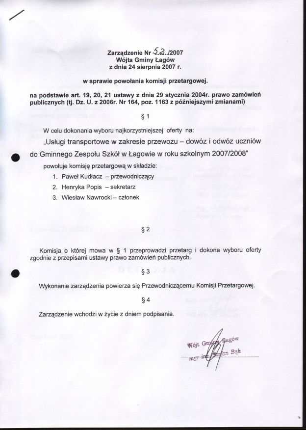 | Zarządzenie nr 52/07 Wójta Gminy Łagów z dn. 24 sierpnia 2007 r. w sprawie powołania komisji przetargowej. | 2008-08-26 |