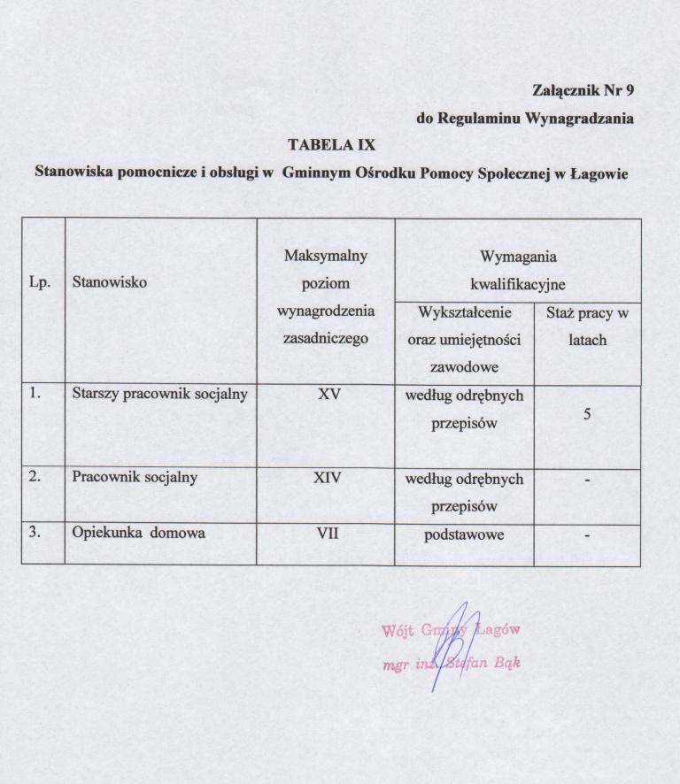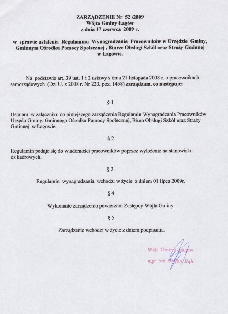 | Zarządzenie nr 52/09 Wójta Gminy Łagów z dnia 17 czerwac 2009r. w sprawie ustalenia Regulaminu Wynagrodzeń Pracowników w Urzędzie Gminy, Gminnym Ośrdku Pomocy Społecznej, Biurze Obsługi Szkół oraz Straży Gminnej w Łagowie. | 2009-07-20 |