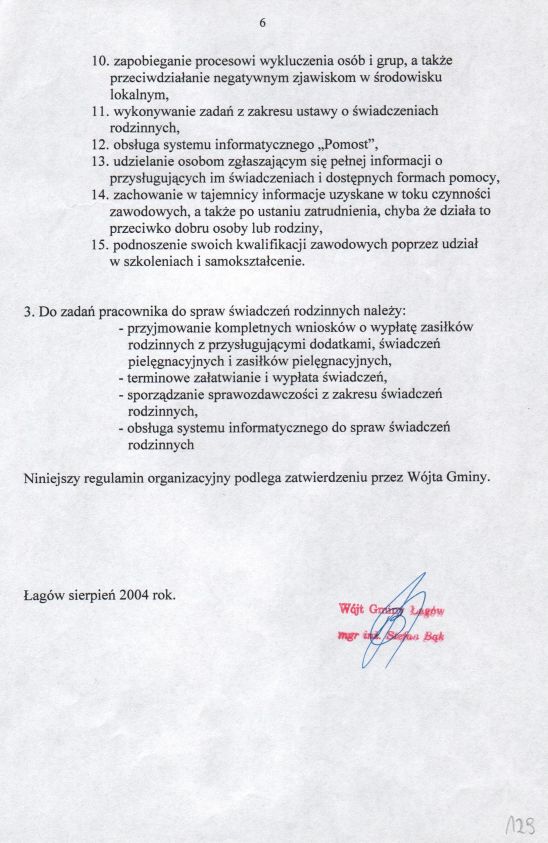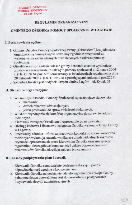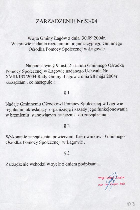 | Zarządzenie nr 53/04 Wójta Gminy Łagów z dn. 30 września 2004 r. w sprawie nadania regulaminu organizacyjnego Gminnego Ośrodka Pomocy Społecznej w Łagowie. | 2008-10-22 |