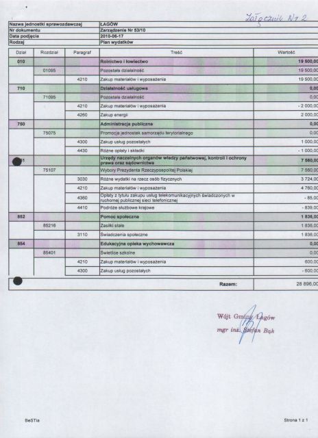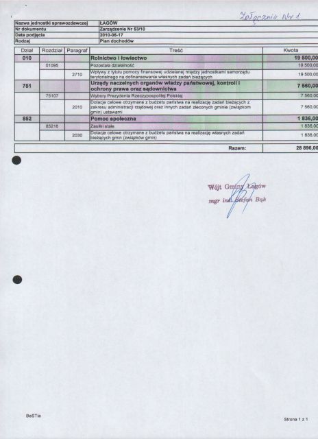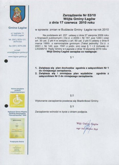 | Zarządzenie Nr 53/10 Wójta Gminy Łagów z dnia 17 czerwca 2010 r. w sprawie : zmian w Budżecie Gminy Łagów na rok 2010 | 2010-09-07 |