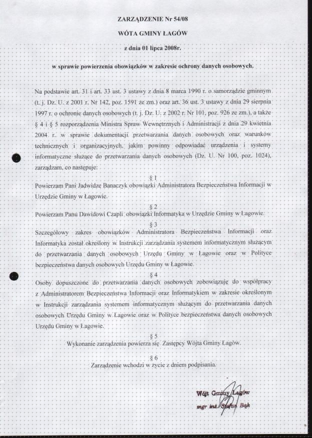 | Zarządzenie nr 54/08 Wójta Gminy Łagów z dn. 1 lipca 2008 r. w sprawie powierzenia obowiązków w zakresie ochrony danych osobowych. | 2008-08-25 |
