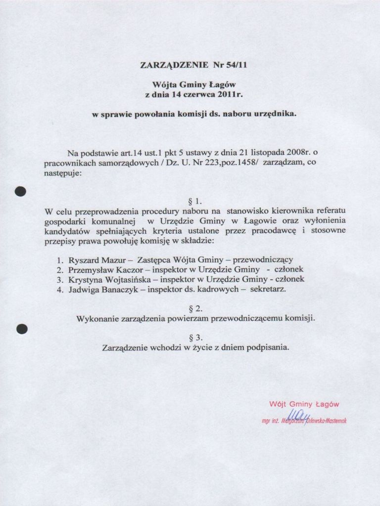 | Zarządzenie Nr 54/11 Wójta Gminy Łagów z dnia 14 czerwca 2011 r. w sprawie powołania komisji ds. naboru urzędnika | 2012-10-03 |